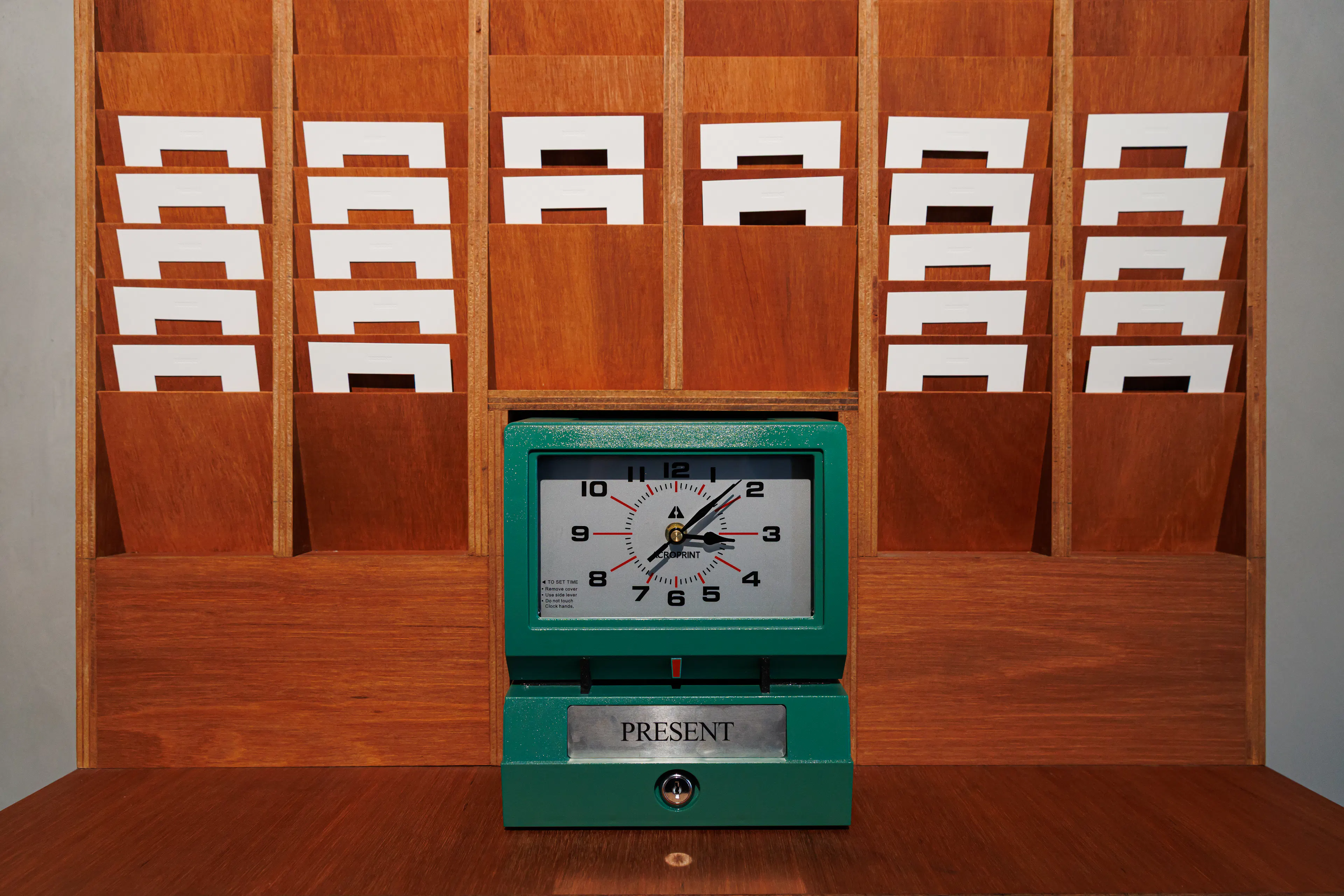 Visitors are invited to pick up a card and insert it into the machine, which stamps the date and time. The card becomes their personal fragment of the timeline — a record of the moment they encountered the work and the sky.
