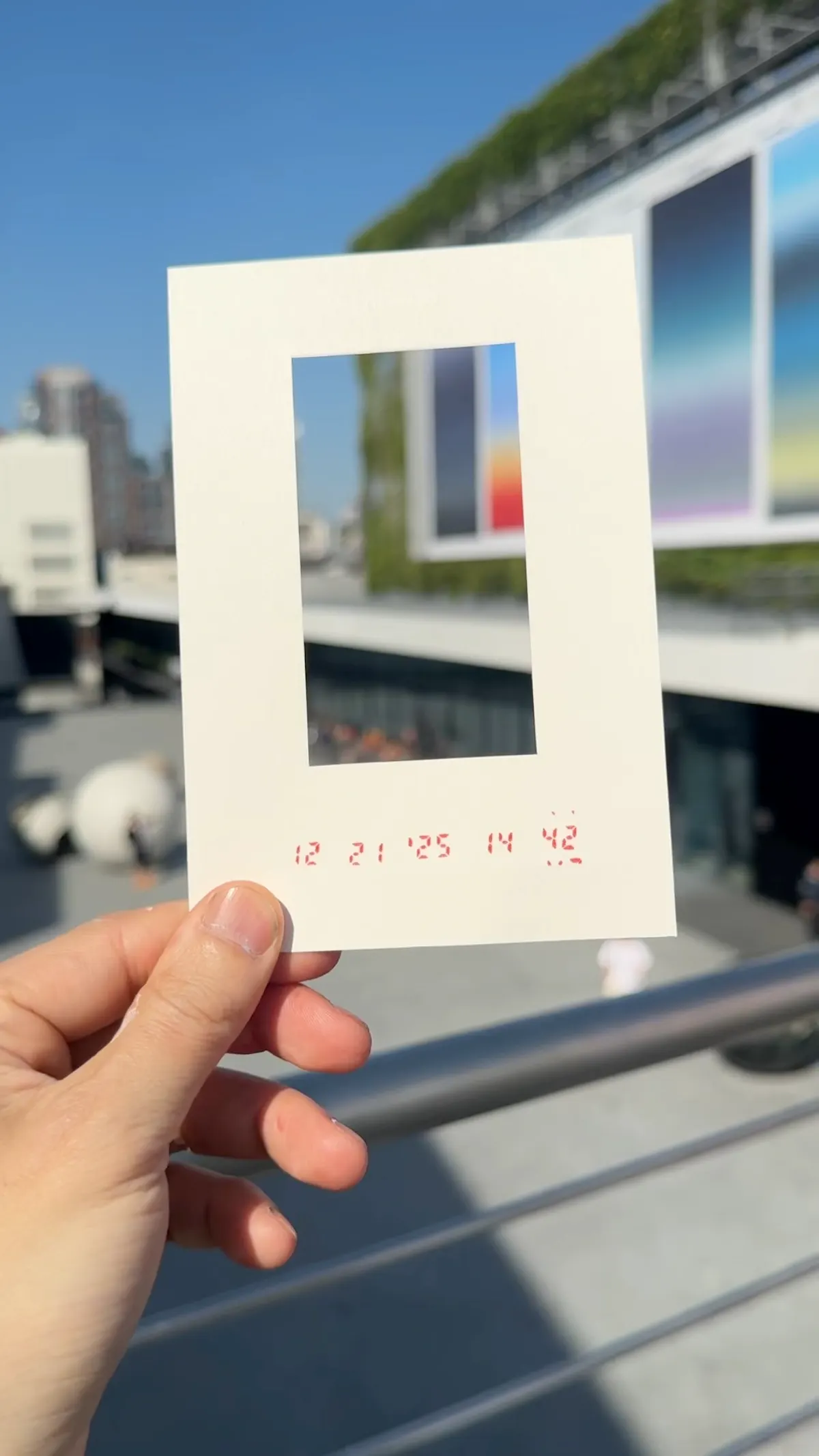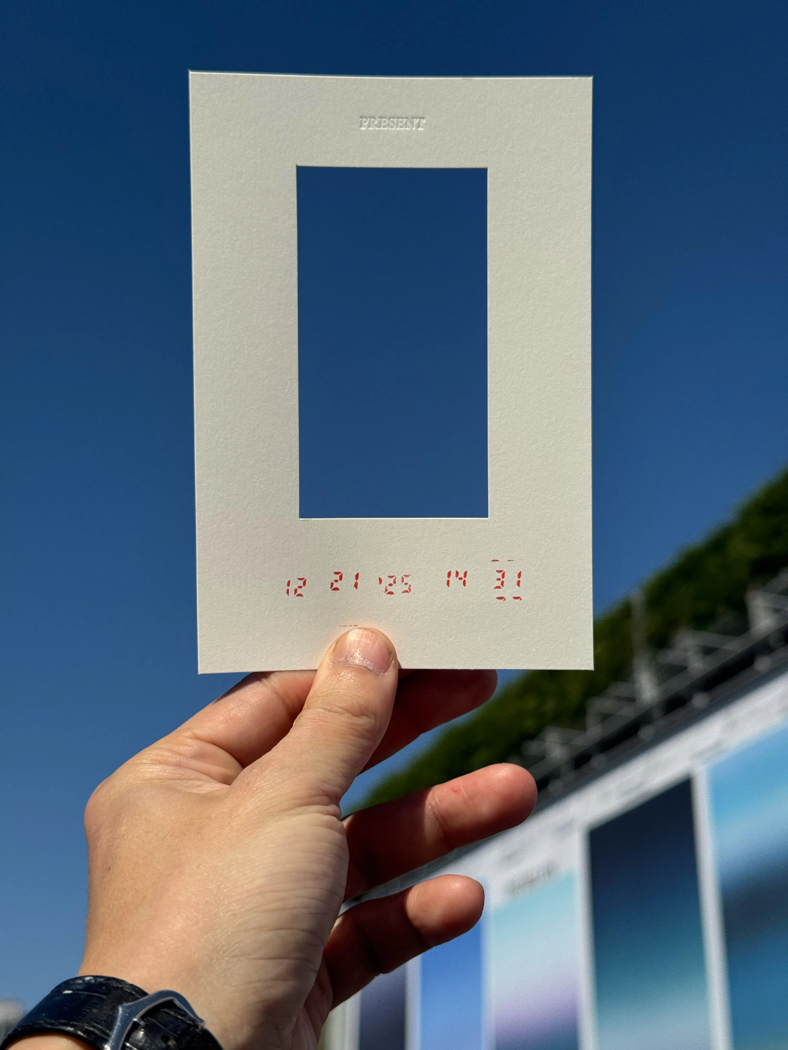 Titled “Present,” the punch card machine creates a participatory experience that invites guests to generate their own memory of the exhibition. Each card is a small artwork visitors can keep — a tangible trace of their time within the space. Through the window cut into the card, guests can look up at the sky, carrying that fleeting view with them as part of their memory.